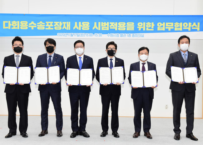 수원시와 환경부, 롯데마트·NS(엔에스)홈쇼핑·오아시스마켓, 온다고(배송업체)는 17일 수원시청 중회의실에서 ‘다회용 포장재 사용 시범 적용을 위한 업무협약’을 체결하고, 수송 포장재 감축을 위해 적극적으로 협력하기로 했다.