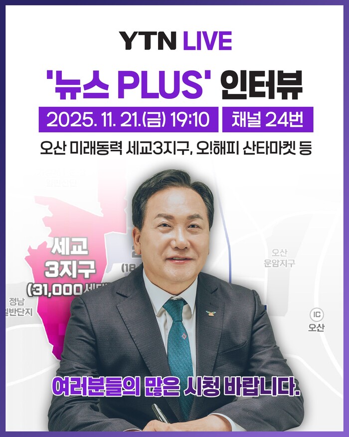 [오산=로컬라이프] 송준형 기자 = 이권재 오산시장은 21일, 오후 7시 10분, YTN ‘뉴스 PLUS’ 인터뷰를 진행한다고 밝혔다.