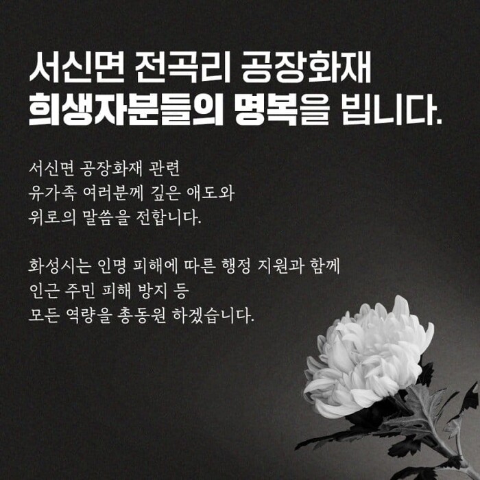 그러면서 서신면 공장화재 관련 유가족 여러분께도 깊은 애도와 위로의 말씀을 전한다고 밝혔다.