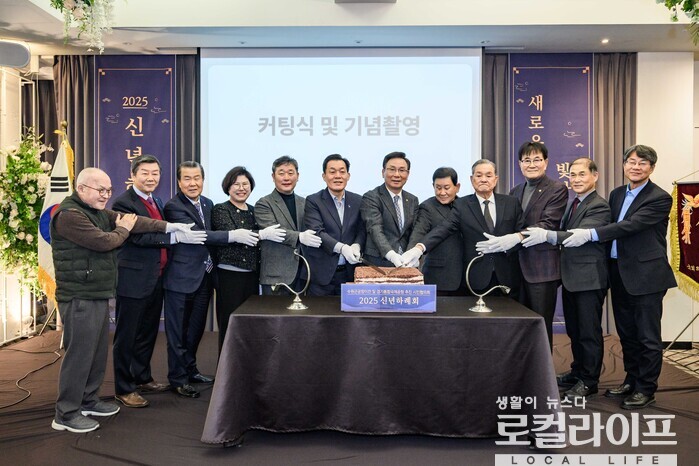 | ▲ '수원군공항이전 및 경기통합국제공항 추진 시민협의회' 2025년 신년하례회에서 조철상 회장(오른쪽에서 여섯 번째), 장성근 고문(오른쪽에서 두 번째), 이재준 수원특례시장(왼쪽에서 여섯 번째) 등 주요 참석자들이 커팅식 및 기념촬영을 하고 있다. (사진제공=수원특례시) |