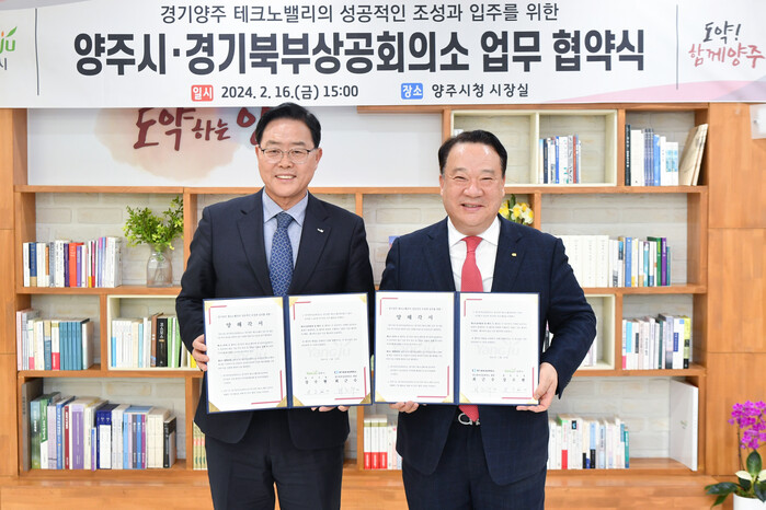 강수현 양주시장이 16일 오후 ‘경기북부상공회의소(회장 최근수)’와 ‘경기양주 테크노밸리 입주 및 상호 협력을 위한 업무협약(MOU)’을 체결했다.