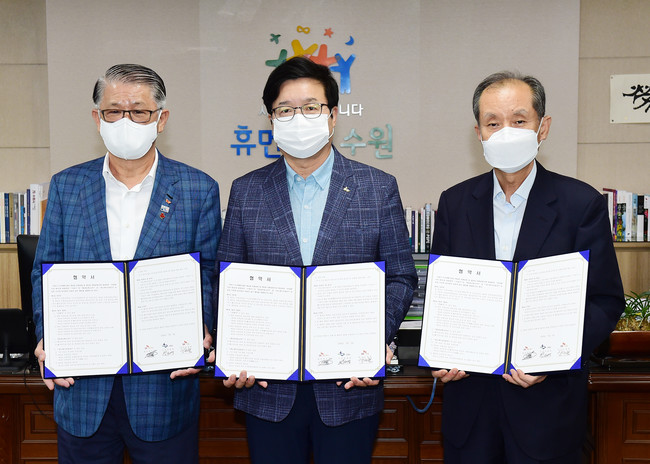 <사진/ 염태영 시장(가운데)과 최신원 SK네트웍스 회장(왼쪽), 홍지호 수원상공회의소 회장이 협약 후 함께하고 있다>