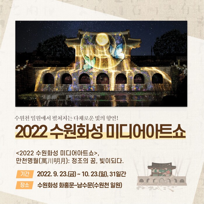 그러면서 수원화성을 즐길 수 있는 4개 가을 축제, 2022 힐링폴링 수원화성, 정조의 꿈을 빛으로 그린 수채화, ‘수원미디어아트쇼’로 시작된다면서, 시민 여러분 모두 함께 즐겨주시길 바란다고 전했다.