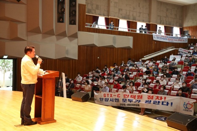 [안양=로컬라이프] 송준형 기자 = 최대호 안양시장이 GTX-C노선의 인덕원역 정차는 공익과 많은 시민들이 혜택을 볼 수 있다는 점에서 반드시 필요하다고 강조했다. 또 지속가능한 도시발전과 후손을 위해서도 이뤄져야 하며, 시민들의 의지와 열정을 바탕으로 해결해 나가겠다고 역설했다.