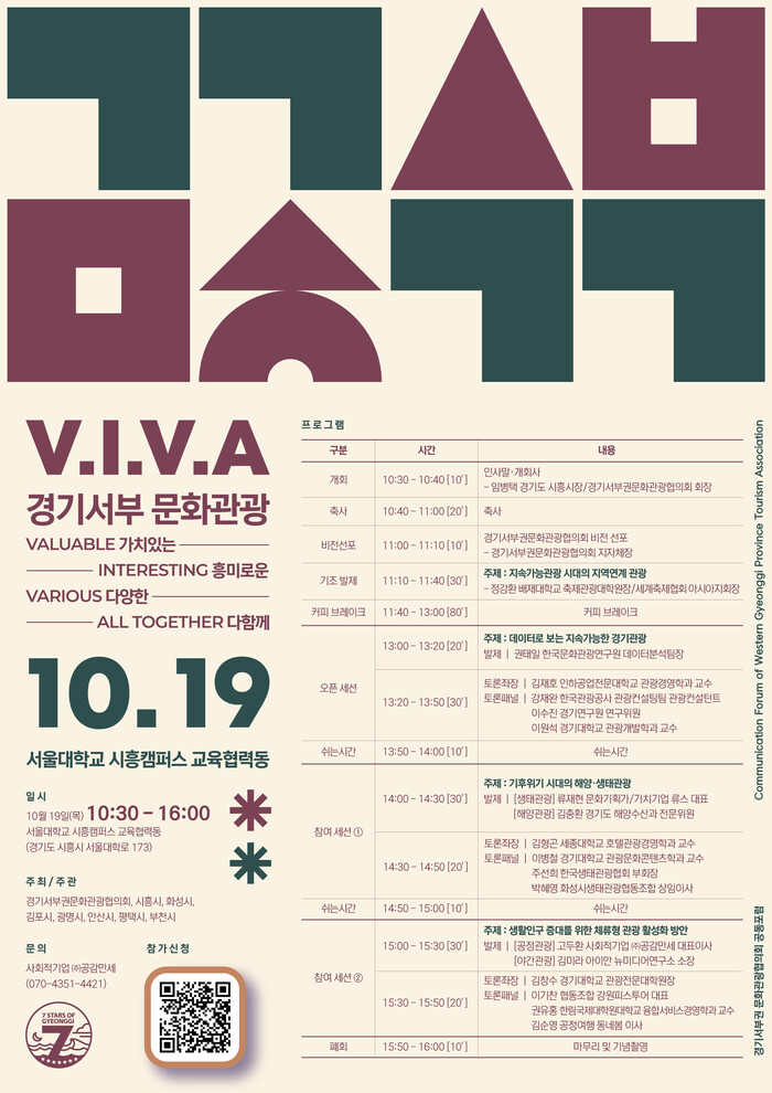 시흥시(시장 임병택)는 오는 19일 서울대학교 시흥캠퍼스 교육협력동에서 경기서부권문화관광협의회 공동포럼인 V.I.V.A(valuable 가치있는, interesting 흥미로운, various 다양한, all together 다함께) 경기서부문화관광을 개최한다.