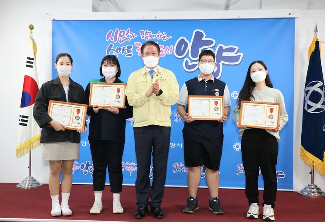 [로컬라이프] 최대호 안양시장은 25일 2021년 안양시 모범청소년 상 시상식을 했다고 밝히며, 제5회 안양시 청소년 상으로 선정된 장다연, 최민주,남기혜,김연재 님의 수상을 진심으로 축하한다고 말했다.
