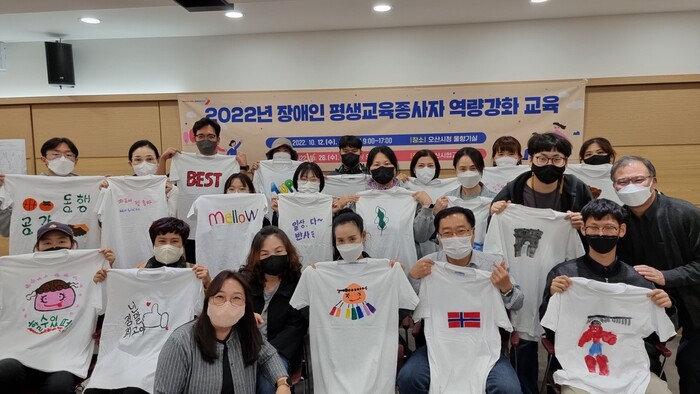 이번 교육은 오산성인씨앗 야간학교, 장애인부모연대 오산지부 등 10개 단체 종사자 20여 명과 장애인 평생교육 양성과정 수료자 15여 명이 참여한 가운데 공정과 평등에 대한 평생학습 감수성 키우기, 오산시 평생학습에 대한 생각을 티셔츠로 표현하기, 소통과 협력의 필요성, 장애인 평생교육 담당자의 역할 바로 알기 등의 내용으로 진행했다.