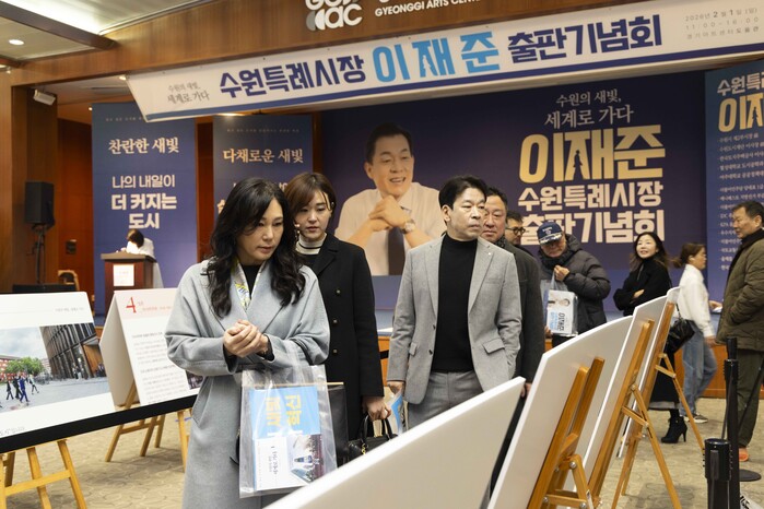 | ▲ 연단에서 이재준 시장과 기념촬영을 하는 수원시민들. (사진제공=출판사 라의눈) |