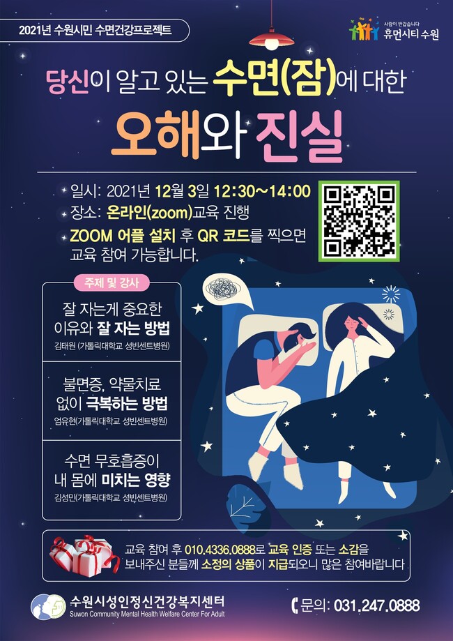 ‘당신이 알고 있는 수면(잠)에 대한 오해와 진실’을 주제로 하는 수원시민 수면건강프로젝트는 가톨릭대학교 성빈센트병원 정신건강의학과 전문의들의 강의로 진행된다.