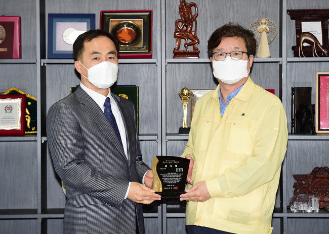염태영 시장은 11일 선거연수원을 찾아 김주헌 선거연수원장에게 감사패를 전달했다.