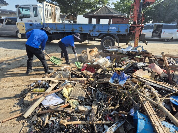 25일 시에 따르면, 80여명의 안양시 재난재해봉사단은 이날 예산군 신암면을 찾아가 집게차, 살수차 등 복구 장비를 투입해 폭우로 폐허가 되어버린 비닐하우스의 잔재를 치우고, 망가진 농작물을 수거하는 등 농가의 피해를 신속하게 복구하는데 힘을 모았다.