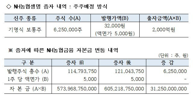 금차 발행하는 주식은 신주 기명식 보통주 6,250,000주로 주주배정 방식에 따라 1대 주주인 농협금융지주가 전액 인수한다.