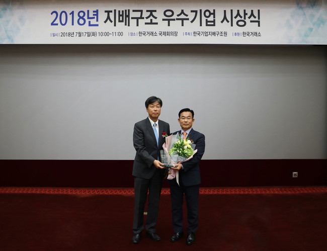 풀무원이 17일 한국기업지배구조원(KCGS)주관으로 서울 여의도 '한국거래소 국제회의장'에서 열린 '2018 지배구조 우수기업 시상식에서 국내 종합식품기업 가운데 유일하게 비금융 부문 '우수기업' 상을 수상했다. 한국지배구조원 조명현 원장과 풀무원 이상부 전략경영원장(오른쪽)이 기념 사진을 찍고 있다. /사진제공=풀무원
