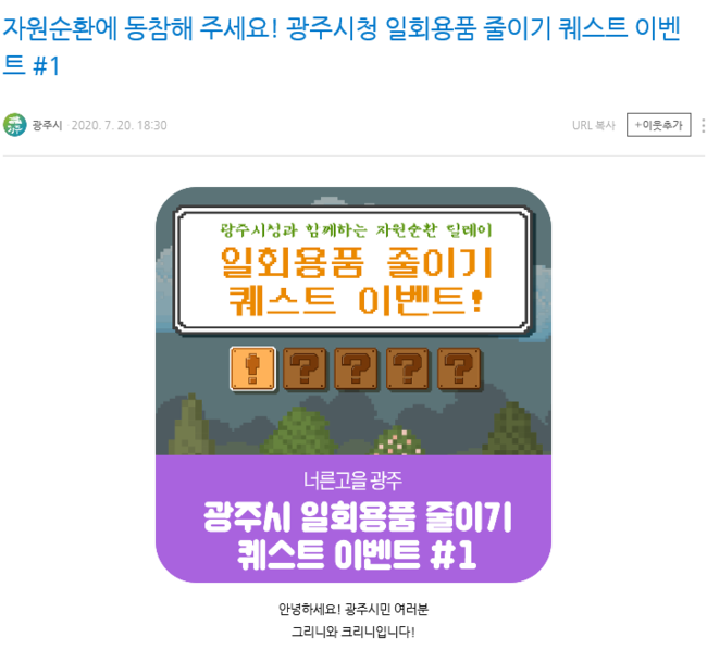 테마 주제로는 1회용품 사용자제 다짐 손 글씨 쓰기, 개인 컵 사용하기 등이며 이벤트는 시 공식 블로그, 페이스북, 인스타그램을 통해 확인할 수 있다.