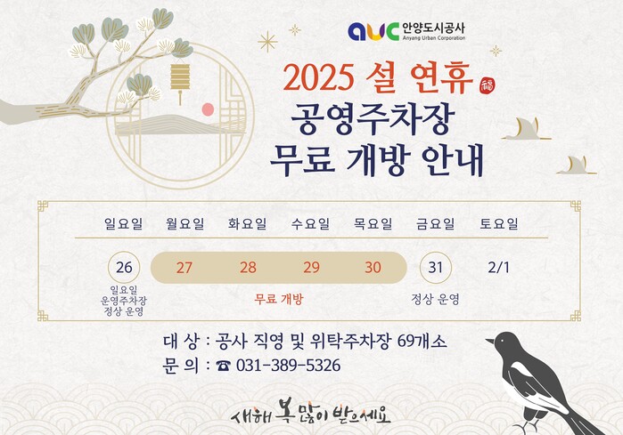 안양시 관내 69개소의 공영주차장은 설 연휴(1. 27.~1. 30.)기간 동안 무료 개방된다. 특히 공사는 연휴에 인구가 밀집하는 안양역과 범계역 주변 주차장과 제사 준비를 위한 중앙시장, 남부시장 등 전통시장 주변 공영주차장을 무료 개방해 편안한 명절맞이를 도울 계획이다.