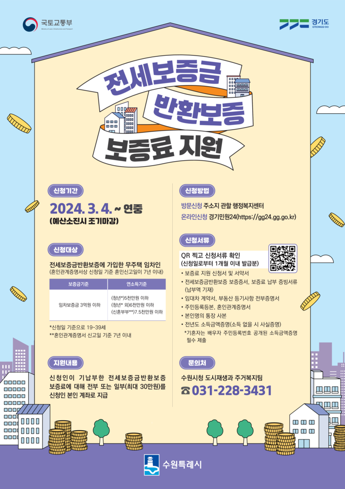 수원시가 전세보증금반환보증에 가입한 시민을 대상으로 보증료를 지원하는 ‘전세보증금 반환보증 보증료 지원사업’ 신청자를 모집한다.