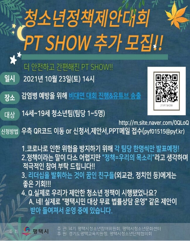 10월 23일(토) 운영 예정인 청소년 정책제안대회< PT SHOW>는 관내 14세~19세 청소년팀(1인~5인)이 참여할 수 있으며, 추가 모집은 10월 17일까지이다.