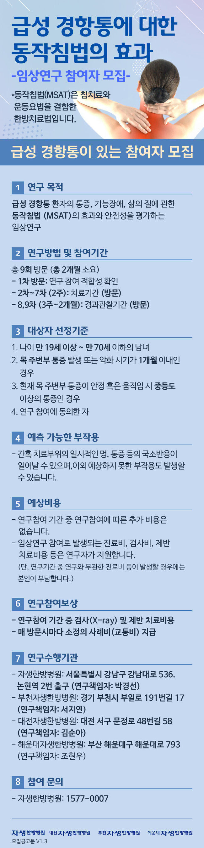 자생한방병원 척추관절연구소(소장 하인혁)는 급성 경항통(목통증) 환자의 통증, 기능장애, 삶의 질에 대한 동작침법(MSAT)의 효과와 안전성을 평가하기 위해 임상연구 참여자를 모집한다고 9일 밝혔다.