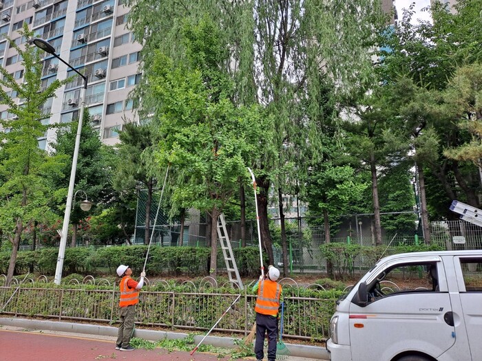 사진/가로수 은행(암)나무 가지치기 작업을 하고 있다(사진제공=수원시)