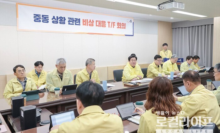 이어 "중동상황 대처 비상경제 대응, 그리고 중요 현안과제 점검회의이다"라며 "중동 분쟁으로 인한 물가관리, 기름값, 기업애로사항 점검등 예의 주시가 필요하다. 전철, 도로, 투자유치, 민생과제등 중요 현안과제도 적극 관리 점검해야 한다. 중단없이! 할 일은 해 나가겠다. 더 빠르게 더 열심히! 감사하다"고 말했다.