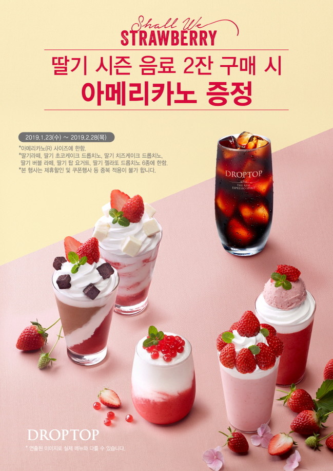커피전문점 카페 드롭탑이 딸기 신메뉴 출시를 기념해 오는 2월 28일까지 아메리카노 증정 프로모션을 진행한다.