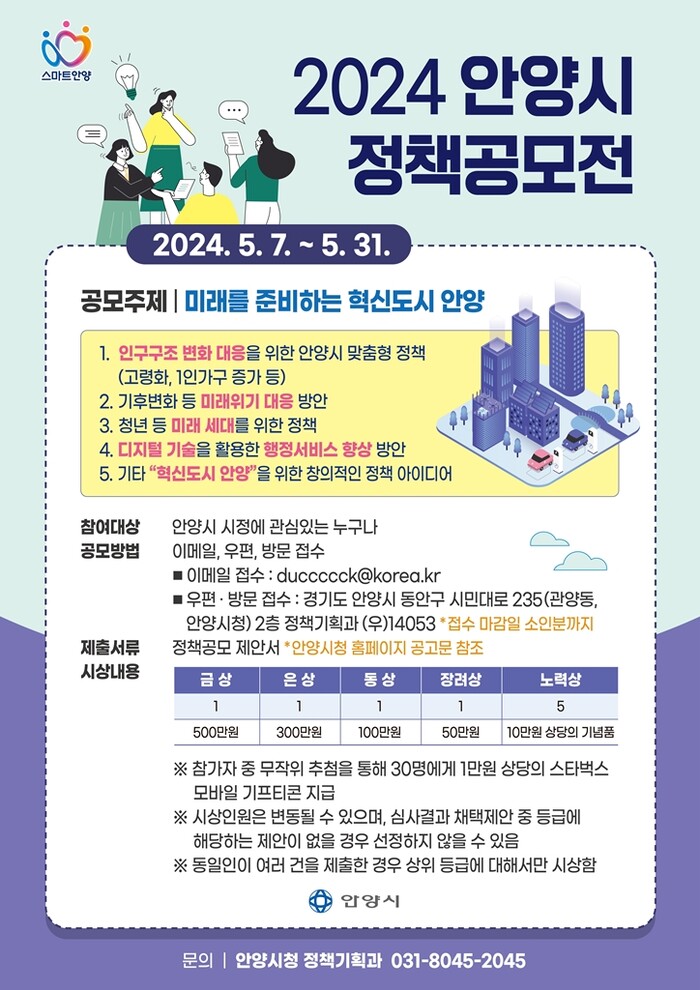 더 자세한 사항은 안양시청 홈페이지 공고문을 참고하거나, 안양시 정책기획과(☎031-8045-2045)로 문의해 안내받을 수 있다.
