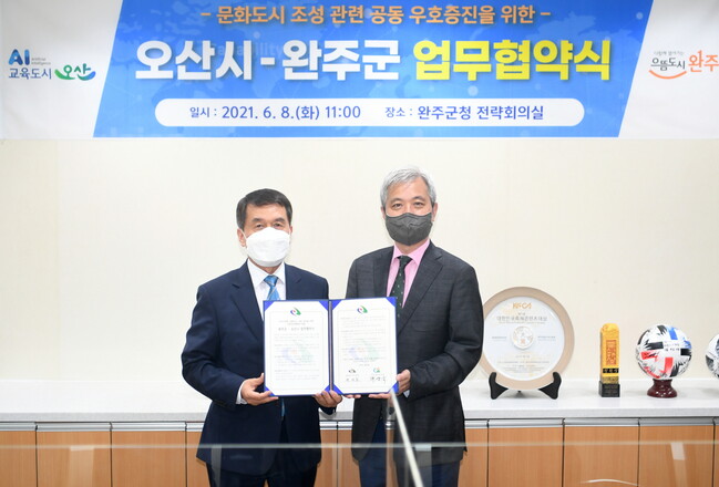 오산시(시장 곽상욱)는 8일 전북 완주군청에서 오산시의 문화도시 최종 지정과 완주군의 원활한 문화도시 사업추진을 위한 상생협약을 체결했다고 전했다.