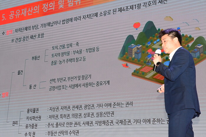 김광현 강사는 공유재산 시스템 활용, 공유재산 변상금 부과 방법 등을 설명하고, ▲사용자 편의 확충 ▲통합정보 활용체계 마련 ▲위치기반 관리 기능 제공 ▲대국민 정보 개방 등 공유재산 관리기능 개선 방안을 소개했다.