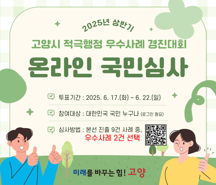 고양특례시(시장 이동환)는 오는 24일 ‘2025년 상반기 고양시 적극행정 우수사례 경진대회’를 개최해 시민행복을 위해 적극행정을 펼친 우수공무원을 선발한다고 밝혔다.