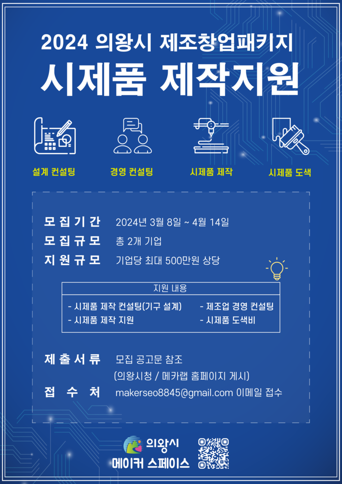 의왕시(시장 김성제) 메이커 스페이스는 제조 분야 진출을 희망하는 예비·기창업자를 육성하고 경쟁력 강화를 돕기 위해‘2024 제조창업패키지 시제품 제작 지원사업’을 추진한다고 밝혔다.