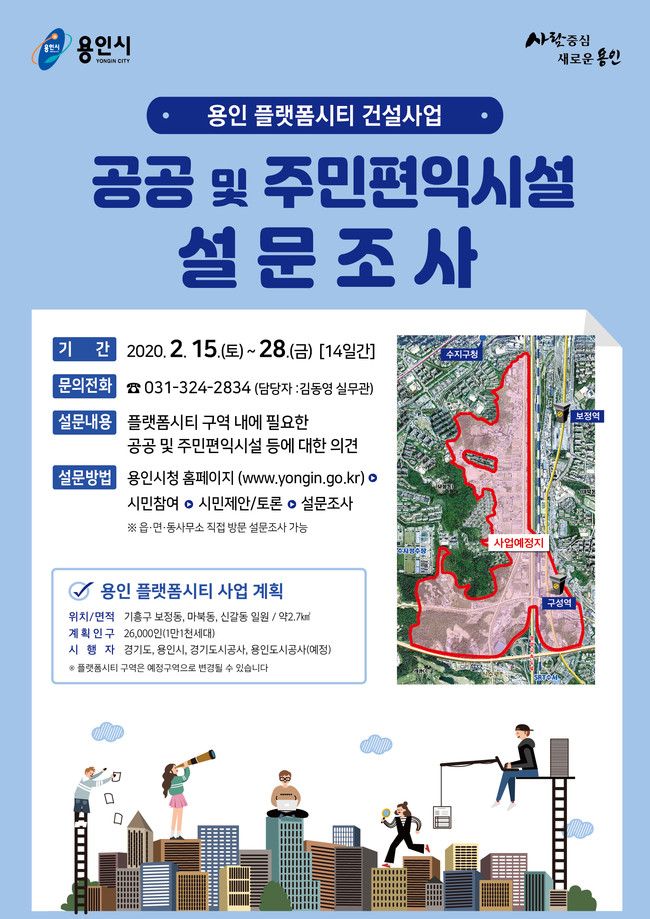 시 관계자는 “용인시의 경제도심이 될 플랫폼시티에 시민들이 필요로 하는 공공편익시설을 충실히 반영하기 위해 이번 조사를 계획했다”라며 “시의 미래를 위해 중요한 사업인 만큼 많은 시민이 좋은 의견을 제시해주기 바란다”라고 말했다.