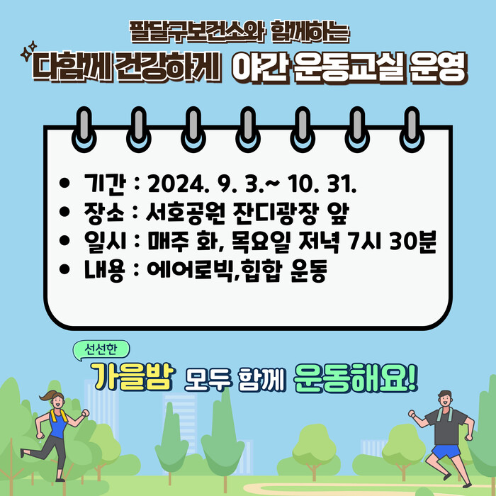 야간 운동교실은 9월 3일부터 10월 31일까지 매주 화·목 오후 7시 30분부터 팔달구 서호공원 잔디광장·무대에서 1시간 동안 진행된다. 누구나 현장에서 자유롭게 참여할 수 있다.