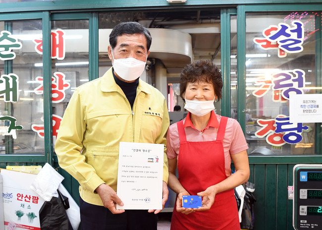 윤 시장은 식당가게에서 선결제를 한 뒤 영수증 인증샷을 촬영하는 등 착한소비를 촉진하는 선결제 캠페인을 적극 알렸다.