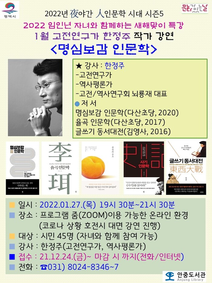 평택시(시장 정장선) 안중도서관은 2022년 1월 야간인문학 한정주 작가의 <명심보감 인문학>을 운영한다.