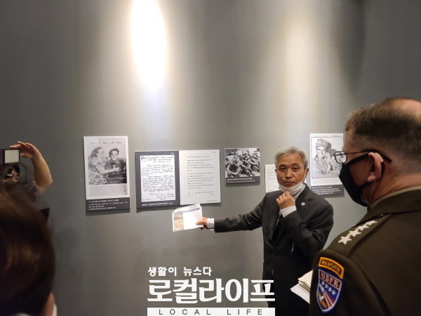 | ▲ 곽상욱 오산시장은 ‘죽미령 평화공원’을 관광 명소화 하고 미래지향적으로 확장·발전시켜 세계의 평화문화의 장으로 발전시킨다는 구상이다. 사진은 행사 후 곽상욱 시장이 참석자들에게 죽미령 평화공원 내 스미스 평화관을 안내하고 있다. (사진=김민정 기자) |