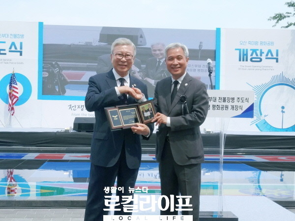 | ▲ 오산시는 ‘오산 죽미령 평화공원’ 개장식을 6·25 전쟁 및 오산 죽미령 전투 70주년을 기억하고, 유엔군 미 스미스특수임무부대 전몰장병들을 추도하기 위한 행사와 함께 개최했다. 사진은 곽상욱 오산시장(오른쪽)이 김창준 전 미연방 하원의원(왼쪽)에게 공로패를 전달하고 있다. (사진=김민정 기자) |