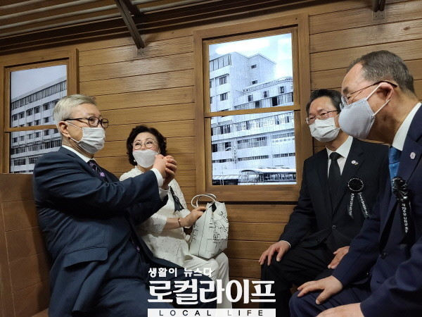 | ▲ 행사 후 참석자들은 오산 죽미령 평화공원 내 ‘스미스 평화관’을 둘러보며 평화의 의지를 다졌다. 사진은 김창준 전 미연방 하원의원과 김창준 전 의원의 부인, 김희겸 경기도 행정1부지사, 반기문 전 유엔 사무총장(왼쪽에서 오른쪽으로)이 ‘스미스 평화관’을 관람하고 있다. (사진=김민정 기자) |