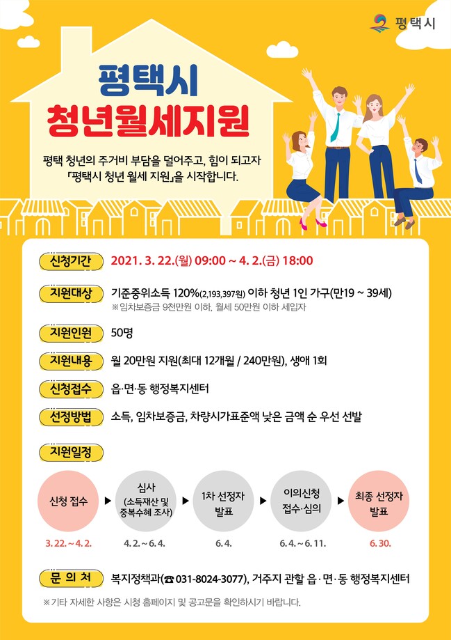 평택시(시장 정장선)가 정주하고 싶은 도시 평택을 만들기 위해 청년들의 주거비 부담을 완화하는 청년 월세 지원 사업을 시작한다.