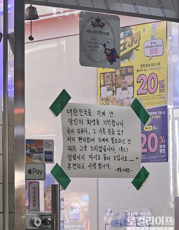 [수원=로컬라이프] 송준형 기자 = 수원의 한 편의점에서 국가유공자와 그 가족들에게 감사의 마음을 전하는 메모를 게시해 눈길을 끈다.