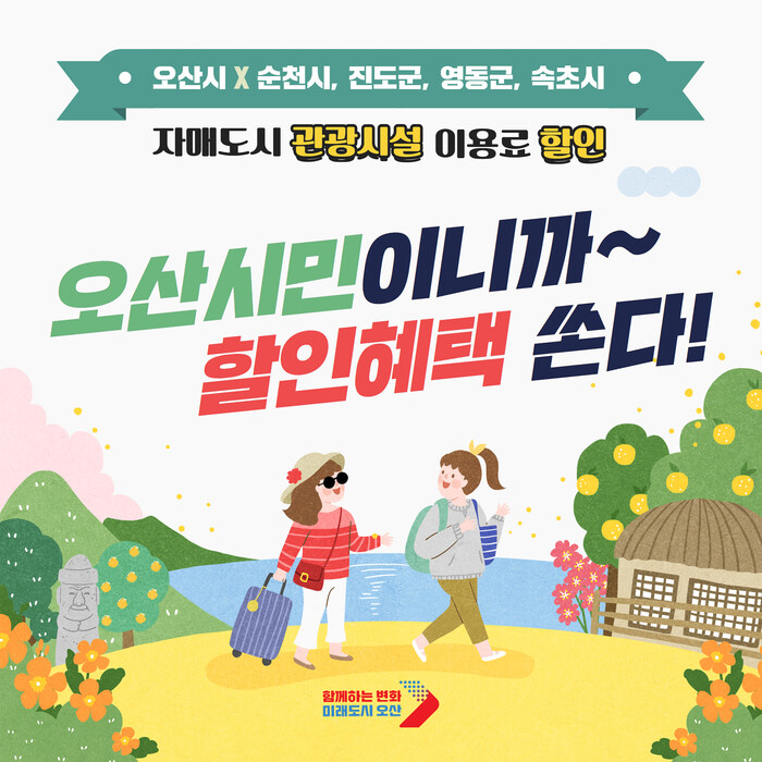 [오산=로컬라이프] 송준형 기자 = 오산시는 자매도시 관광지 오산시민 할인 혜택을 소개하며, 이중 우리 시민들이 체감할 수 있는것이 관광지 이용료 할인인데, 관련 조례에 따라 상호 혜택을 주고받을 수 있다고 밝혔다.