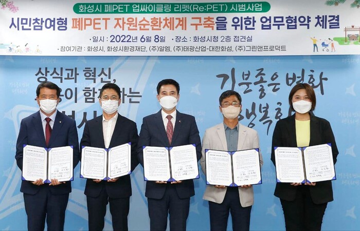 이날 서철모 화성시장과 신진철 (재)화성시환경재단 대표이사, 임범진(주)알엠 대표이사, 정철현 태광산업(주)대한화섬(주) 대표이사, 박은정 ㈜그린앤프로덕트 대표이사가 참석했다.
