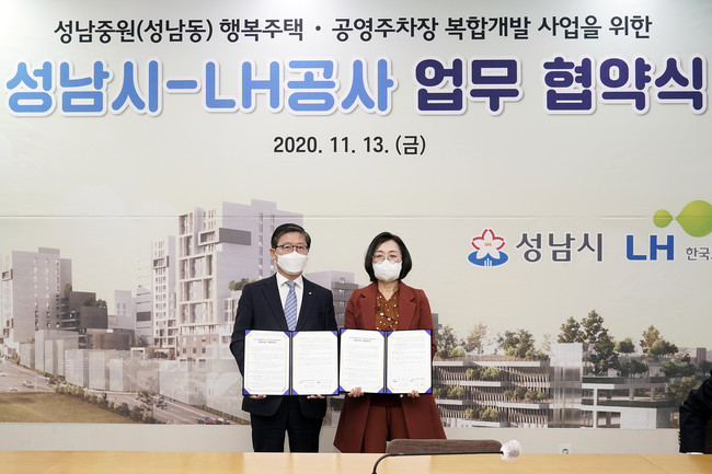 시는 11월 13일 은수미 성남시장과 변창흠 한국토지주택공사(LH) 사장, 윤영찬 국회의원, 지역구 시의원, 주민대표 등이 참석한 가운데 ‘성남중원 행복주택・ 공영주차장 복합개발사업’ 추진을 위한 업무협약을 체결했다.