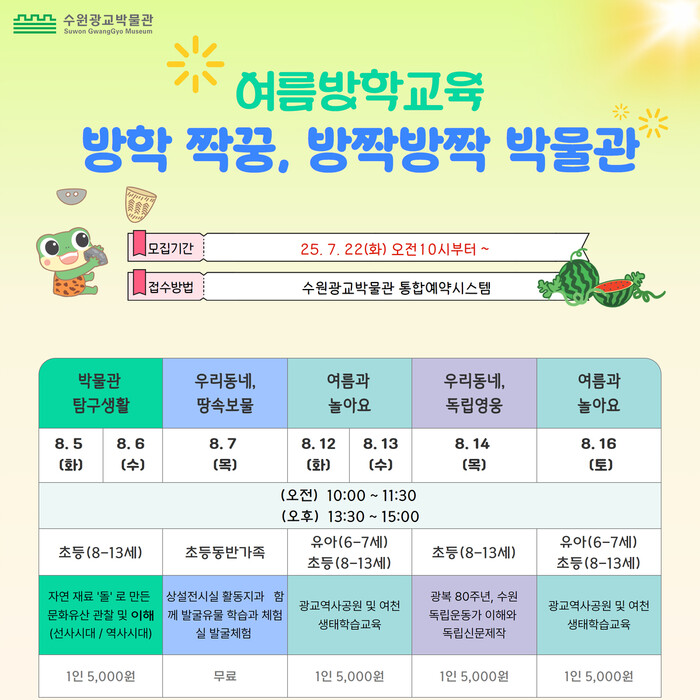 참여 대상은 유아(6~7세), 초등학생, 초등학생 동반 가족 등이다. 수원시박물관사업소 통합예약시스템(https://rmuseum.suwon.go.kr)에서 7월 22일 오전 10시부터 신청하면 된다.