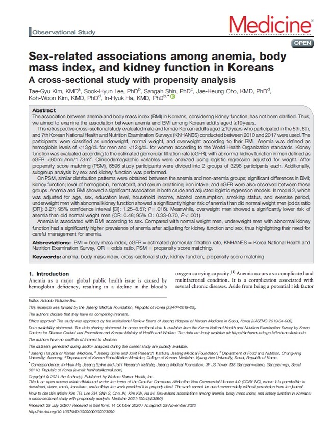 자생한방병원 척추관절연구소(소장 하인혁) 김태규 한의사 연구팀은 최근 논문을 통해 신장기능이 떨어지고 저체중인 남성은 정상 체중 남성보다 빈혈 위험도가 3배 이상 높은 것으로 나타났다고 16일 밝혔다. 해당 논문은 SCI(E)급 국제학술지인 ‘메디슨(Medicine, IF=1.552)’ 1월호에 게재됐다.