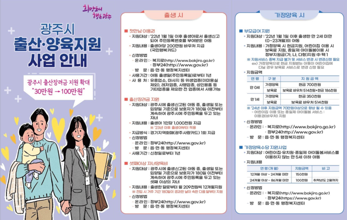 출산장려금은 출산가정의 경제적 부담을 줄이기 위해 광주시에 출생신고 된 아동 중 보호자가 180일 이전부터 계속해 광주시에 주민등록을 두고 있는 자녀를 대상으로 지원하는 사업이다. 지원금은 지역경제 활성화를 위해 지역화폐로 지급된다.