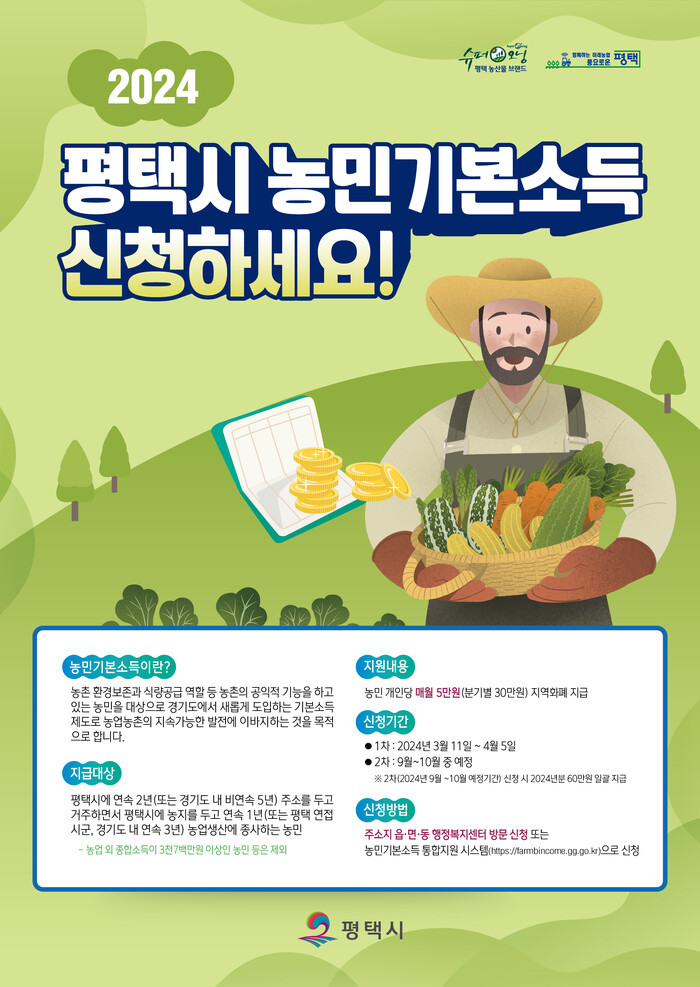 평택시(시장 정장선)는 오는 11일부터 4월 5일까지 농민기본소득 신청을 받는다고 밝혔다.