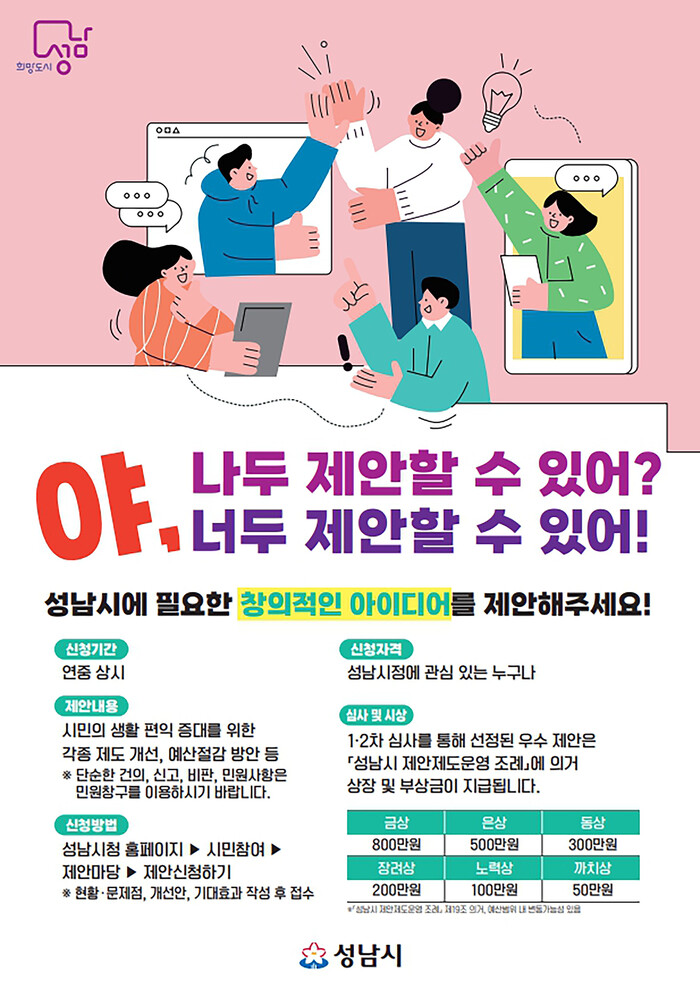 성남시(시장 신상진)가 성남시민들의 창의적인 아이디어를 반영한 정책 발굴을 위해 시민 정책 제안제도‘야, 너두(DO)’를 운영한다고 10일 밝혔다.