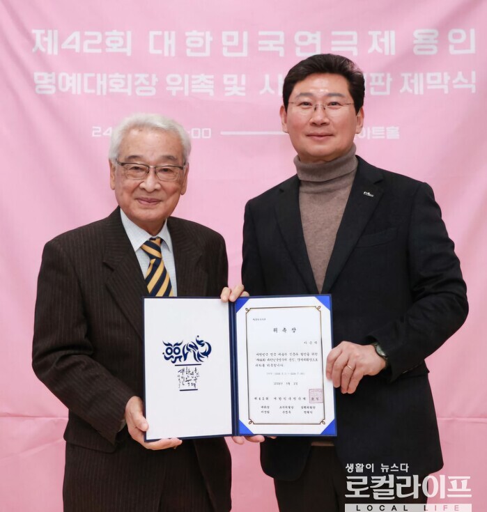 | ▲ 이상일 용인특례시장(오른쪽)이 지난해 7월, 고 이순재 배우(왼쪽)를 ‘제42회 대한민국 연극제’ 명예대회장으로 위촉하고 있다. (사진출처=이상일 페이스북) |