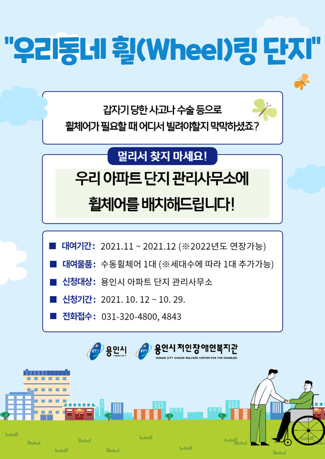 용인시가 갑작스런 사고나 수술 등으로 휠체어가 필요한 시민들을 위해 관내 아파트 단지에 휠체어를 대여해 주는 ‘우리 동네 휠(Wheel)링 단지’프로젝트를 추진한다.