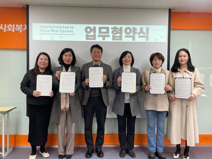6개 기관은 7일 능실종합사회복지관에서 ‘복지사각지대 축소를 위한 수원시의 색다른 대응 프로젝트(수색대) 업무협약’을 체결하고, 협력을 약속했다. ▲정기적인 네트워크 회의 ▲기관별 전문성을 바탕으로 협력 구조 마련 ▲연합 사업의 추진·협력 등이 주요 내용이다.